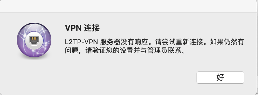 9. 但是, 在苹果电脑上使用上面的步骤来建立L2TP通道的时候, 经常会出现'L2TP-***服务器没有响应'的弹出框, 提示我们L2TP通道建立失败.