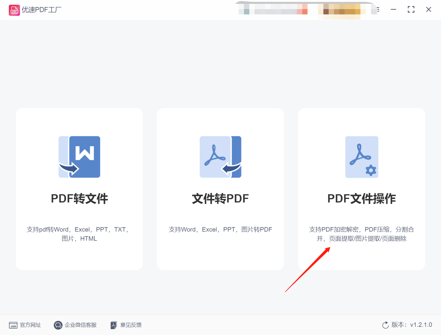 步骤1、在电脑上下载安装优速PDF工厂,打开其主页面后,我们可以看到多种操作功能,其中包含了PDF文件的压缩处理。在这里,我们需要点击“PDF文件操作”;