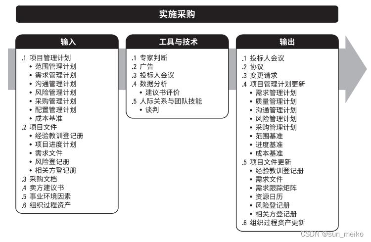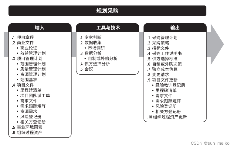 - 作用:确定是否从项目外部获取货物和服务,if是,则还要确定将when、how获取what货物和服务(货物和服务可从执行组织的其他部门采购,或者从外部渠道采购)✌