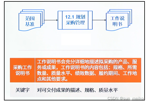 ⭐ 采购工作说明书:依据项目范围基准,为每次采购编制工作说明书(SOW),仅对将要包含在相关合同中的那一部分项目范围进行定义。