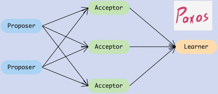 说实话,从今天的角度来阅读此文,Basic Paxos的思路的确是比较好懂。我们可以简单回顾一下,如图2中所展示的,Basic Paxos中一共有三类角色:其一提议者Proposer,其二接收者Acceptor,其三学习者Learner。基于实现就某个值达成共识这个具体目标,Basic Paxos全异步地经历如下三个阶段: