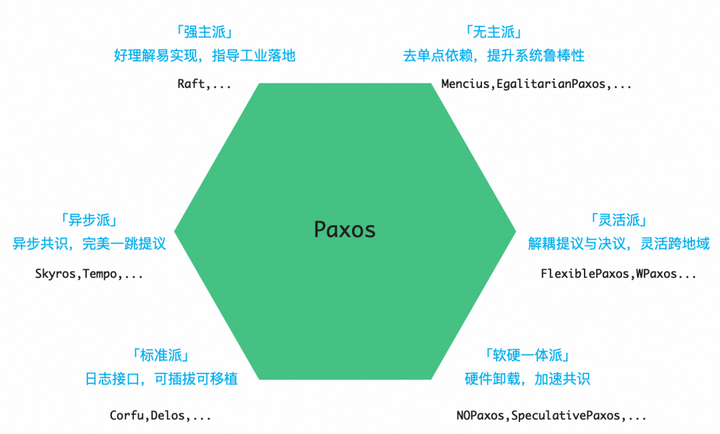 话说回来,我们有理由相信,人们对于Paxos共识协议的热情被Google的这篇文章给重新点燃,越来越多的厂商、研究工作者投身其中,探索并持续改进共识协议,然后等到了2014年Raft的横空出世 ...... 如图4所示,我们梳理了这些年的共识领域的各类研究工作,把共识领域的演进工作分为六大方向,接下来的篇幅,我们集中注意力,逐一说道说道共识领域的这六大门派: