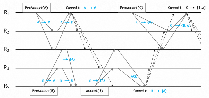 以图10为例,副本R1提议请求A,收集多数派情况没有发现有依赖关系,直接发送COMMIT消息;而副本R5发送的提议B请求,多数派回复收集回来发现有B依赖A的关系,那么再将B->{A}这个依赖作为ACCEPT请求广播给其余副本。在收到多数派相应之后(请求之间依赖关系是面向过去的,因此多数派反馈的依赖合集就可以作为决议直接使用),广播COMMIT给各个副本。进一步地,副本R1再提议请求C,多数派响应都是C->{B, A},那么也是直接达成共识,广播COMMIT给各个副本。