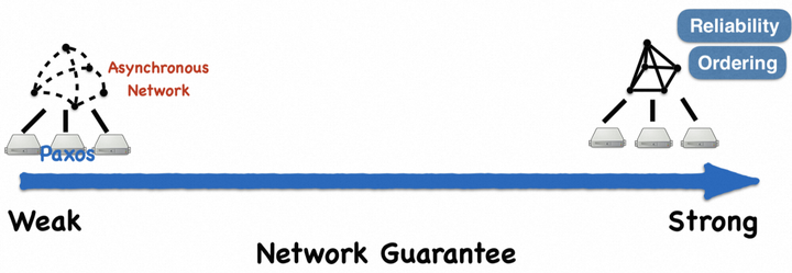 我们首先来看第一类研究工作,增加网络能力的承诺。我们知道,Lamport提出共识协议时候对于网络的假设是完全异步的,也就是说信息传输可能会丢失,可能会乱序,也可能发生延迟抖动甚至超时等等。基于这样的假设,Paxos等共识从协议层面增加了各种设计,保证了一致性的性质,但是也增加了软件复杂性并且存在执行效率的瓶颈。必须得说,Lamport的异步网络假定对于Internet网络是合理的人设设定。不过当前数据中心内的网络状态显然要可控多了,能否提供一些可靠性的保证呢?如图18所示,事实上,如果网络侧能够做出更多可靠性承诺,共识达成的难度会降低很多。这个方向已经有很多相关研究成果,譬如NetPaxos,Speculative Paxos,NOPaxos,Hydra等。这里我们着重介绍一下来自OSDI’16的NOPaxos(注意,这个取名是抖了个机灵,实际是指Network Ordering Paxos),它的假定即网络可以提供可靠的定序保证,虽然可能会丢失一些链路的请求包。