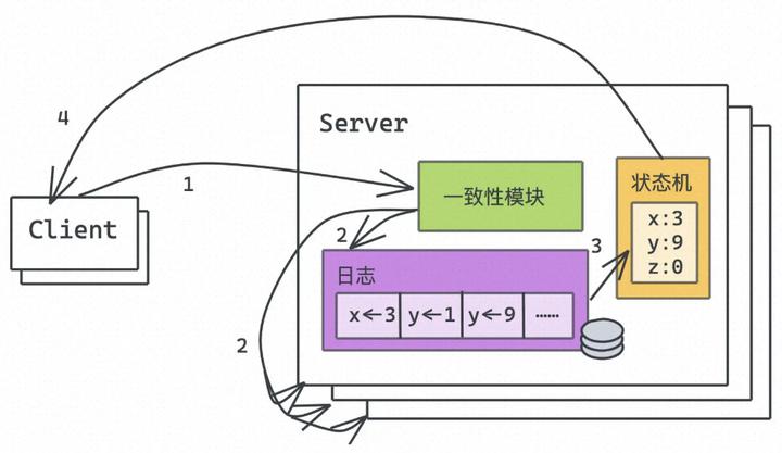 图1. 让分布式系统像“单机”一样工作的复制状态机模型