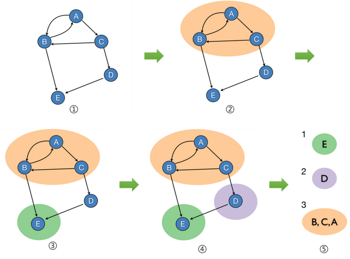当请求提议以及它的依赖项达成共识之后,请求就算提交成功,可以返回客户端了。但是,此时请求决议在全局请求序列中的顺序还没有最终确定,无法直接应用至业务状态机,因此,EPaxos还需要一个额外的排序过程,对已提交的决议进行排序。当决议以及其依赖集合中所有决议都已经完成提交后,副本就可以开始排序过程。我们在图10中给出了一个示例:将每个持久化的决议看作图的节点,决议之间的依赖看作节点的出边,因为每个二维序号对应的决议和依赖项是达成全局共识的,即图的节点和出边在各副本之间已经达成了一致,因此各副本会看到相同依赖图。接下来对决议的排序过程,类似于对图进行确定性拓扑排序,结果即为提议请求的线性顺序。