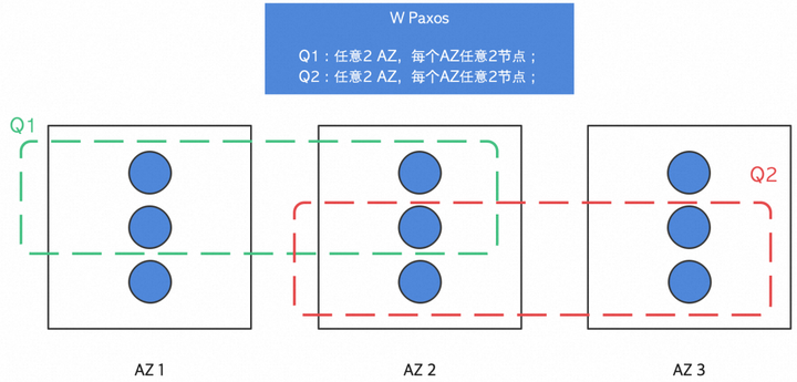 继续举个具体的例子来生动地理解WPaxos的意义吧。譬如有些区域如果是2 AZ,怎么做容灾呢?我们可以在临近一个区域选择一个AZ,这样也是一个3 AZ部署。如图12所示,假如AZ1,AZ2是本地域的2 AZ,而AZ3是跨地域的AZ。按照WPaxos的协议约束,我们可以设定9节点部署,每个AZ部署3个节点。基于“挂1个AZ+挂另一个AZ的1个节点”这个容灾能力的约束,参考上面的WPaxos的参数选择机制,我们可以设定:fz = fn = 1,即Q1是“任意2 AZ,每个AZ任意2个节点”,Q2亦如此。这样的设定真的跟跨地域容灾很搭:无论是PREPARE阶段,还是ACCEPT阶段,提议者都是给所有的节点发送提议或者决议请求,因为就近处理的延时比较低,很大概率我们会先迎回来AZ1/AZ2的请求回应。因此,在常态情况下,我们的IO请求都会在本区域完成。当然,选举也是可以在本区域即可完成。当发生AZ1或者AZ2挂掉的灾难场景,那么两个阶段的参与者会自动切换到AZ2/AZ3,或者是AZ2/AZ3,此时延迟会有所增加,但是服务可用性还在。