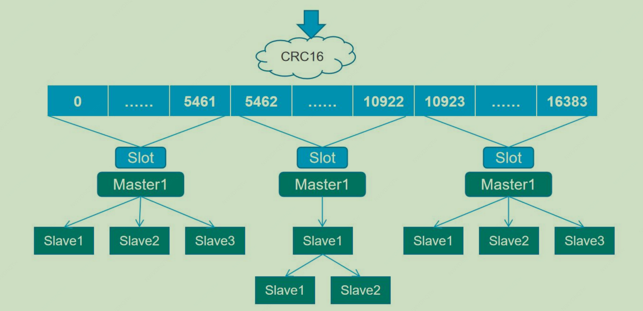Redis 集群将 key 通过 crc16 运算后与 16384 取模,将 key 分布到固定 16384 个槽位(slot)中的一个(0-16383),每个 redis 分别保管不同 的槽位,不同的 Redis 子集群分管不同的槽位,每个子集可用一主多从实现,进行故障自动转移