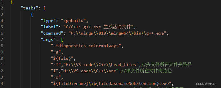 {"tasks": [{"type": "cppbuild","label": "C/C++: g++.exe 生成活动文件","command": "F:\\mingw\\810\\mingw64\\bin\\g++.exe","args": ["-fdiagnostics-color=always","-g","${file}","-o","${fileDirname}\\${fileBasenameNoExtension}.exe","-fexec-charset=GBK" //utf-8转GBK格式,解决中文乱码问题],"options": {"cwd": "${fileDirname}"},"problemMatcher": ["$gcc"],"group": {"kind": "build","isDefault": true},"detail": "调试器生成的任务。"}],"version": "2.0.0"