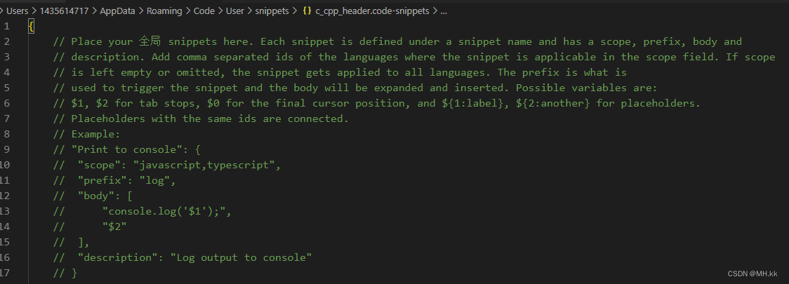 c_cpp_header(该名称可以自定义),会生成c_cpp_header.code-snippets配置文件,默认如下 -