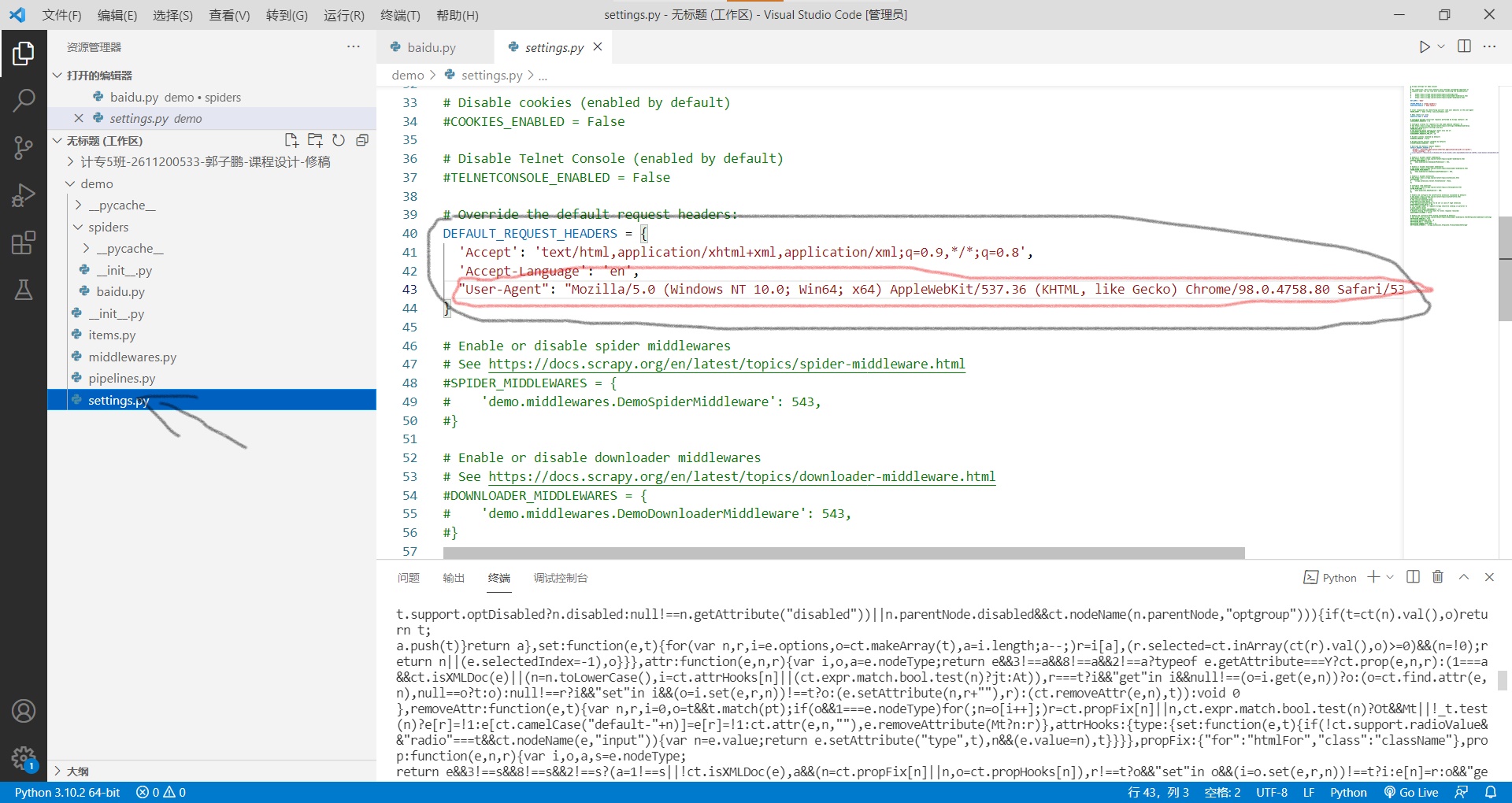 如下图所示,此错误是建立在scrapy框架建立起来的情况下,如图所示,图片左侧是scrapy框架项目结构,出现标题的错误,首先点击如图所示的settings.py文件,找到第40行,如图所示我已经框出来了,这两行刚打开文件时注释的,把这两行注释解开,并且添加"user-agent"字段,这个字段可以在浏览器里面获取,详细就不介绍了,可以自行百度,然后再次运行项目,就可以发现获取到网络的源码了.