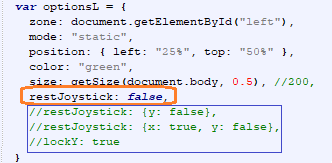 jQuery(function($){var npL = nipplejs.create({zone: document.getElementById("left"),mode: "static",position: { left: "25%", top: "50%" },color: "green",size: 200,restJoystick: { y: false }});var npR = nipplejs.create({zone: document.getElementById("right"),mode: "static",position: { left: "75%", top: "50%" },color: "red",size: 200,restJoystick: false});});
