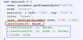 设置restJoystack: {y: false},不能实现操控不归零,虽然restJoyStack: false与restJoyStack: {x: false, y: false}等价,但restJoyStack: {x: false, y: false},也不能实现操控不归零,深入阅读nipple.js文件,它并没有相关的等价功能处理,即仅支持restJoyStack: false或restJoyStack: true。