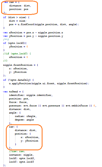 输出信息,定义在nipple.js原文件的Collection.prototype.processOnMove函数的toSend数据块中,项目需要的是不常用的原始raw的x、y值,而不是常用的distance和angle,尽管x和y值可以通过distance和angle计算,但不如让其直接输出更加便捷高效。