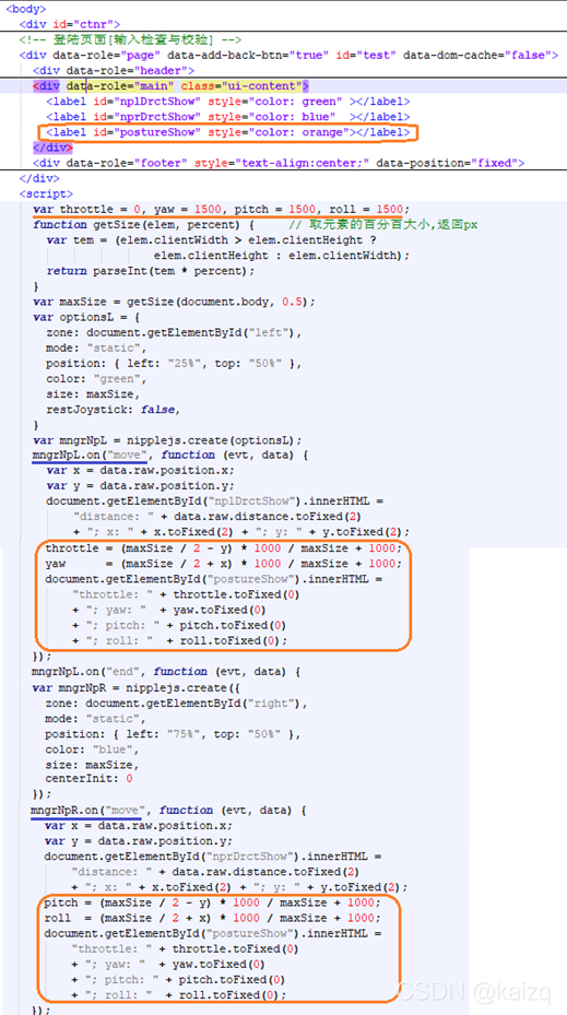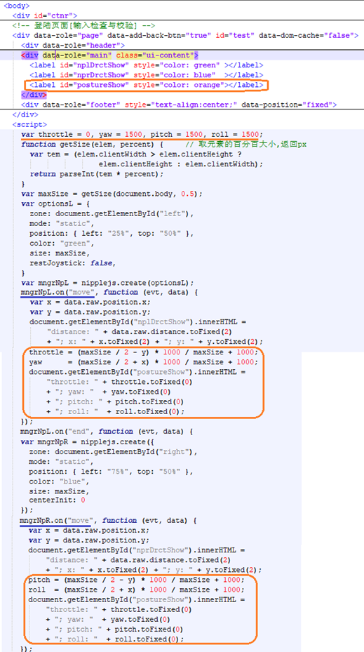 移动手机,虚拟飞控双遥杆,自然选用成熟的nipple.js库,应用APP界面主导的js库是jQuery及其相关UI如JQM,nipple嵌入其中应用。遥杆界面出现了,但操控不对应,尤其是上、左方向,几乎相反。