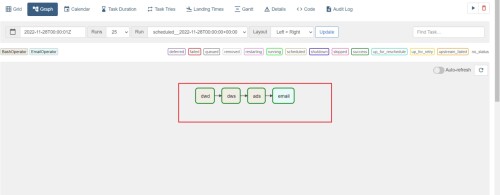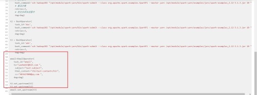 t1 = BashOperator(# 任务idtask_id='dwd',# 任务命令bash_command='ssh hadoop102 "/opt/module/spark-yarn/bin/spark-submit --class org.apache.spark.examples.SparkPi --master yarn /opt/module/spark-yarn/examples/jars/spark-examples_2.12-3.1.3.jar 10 "',# 重试次数retries=3,# 把任务添加进图中dag=dag)t2 = BashOperator(task_id='dws',bash_command='ssh hadoop102 "/opt/module/spark-yarn/bin/spark-submit --class org.apache.spark.examples.SparkPi --master yarn /opt/module/spark-yarn/examples/jars/spark-examples_2.12-3.1.3.jar 10 "',retries=3,dag=dag)t3 = BashOperator(task_id='ads',bash_command='ssh hadoop102 "/opt/module/spark-yarn/bin/spark-submit --class org.apache.spark.examples.SparkPi --master yarn /opt/module/spark-yarn/examples/jars/spark-examples_2.12-3.1.3.jar 10 "',retries=3,dag=dag)email=EmailOperator(task_id="email",to="yaohm163@163.com ",subject="test-subject",html_content="test-content