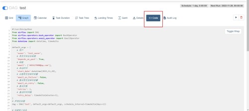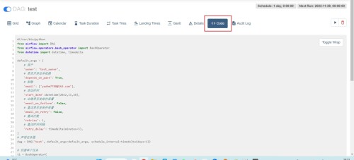 from datetime import datetime, timedeltadefault_args = {# 用户'owner': 'test_owner',# 是否开启任务依赖'depends_on_past': True, # 邮箱'email': ['403627000@qq.com'],# 启动时间'start_date':datetime(2022,11,28),# 出错是否发邮件报警'email_on_failure': False,# 重试是否发邮件报警'email_on_retry': False,# 重试次数'retries': 1,# 重试时间间隔'retry_delay': timedelta(minutes=5),
