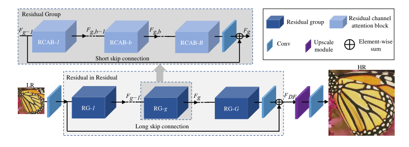 RCAN——深度残差通道注意网络,是通过一种residual in residual(RIR)的结构来形成非常深的网络,网络在大的方面由几个残差群和残差构成,而每个残差群又是由更小的卷积、通道注意力和残差构成。通过这样的一种嵌套的结构,可以将更加复杂的网络建立起来,同时拥有残差以及通道注意力机制,能够使得每一个通道都尽可能地参与到网络的训练之中来。虽然RCAN是更深的网络,但它的参数比EDSR和RDN的参数少,并且其性能效果也更加好。