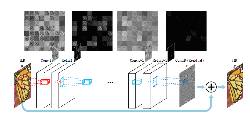 VDSR使用了更加深的网络并且基于VGG使用了更加小的3x3的卷积核,整个网络显得更加深且使用更加小的卷积核,同时在网络的末尾尝试去学习输入图像和插值图像的残差关系,而不是一种直接的从头到尾的映射。