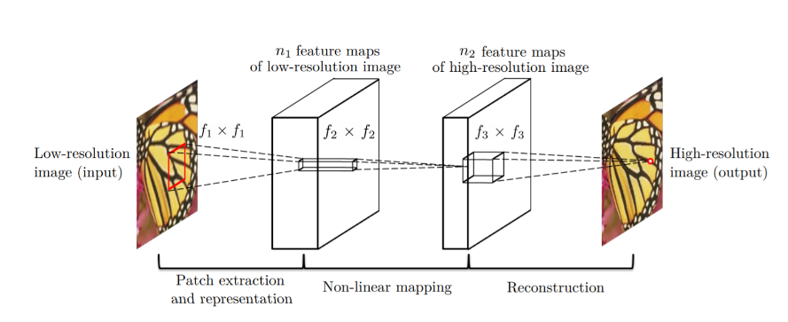 采用CNN卷积神经网络的方法相较于传统的机器学习方法能够带来更大的学习效果,SRCNN是一个简单的CNN架构,它仅仅由三层网络构成,分别是特征提取层、非线性映射层和重建层。输入一个低分辨图像过后,特征提取层从输入提取出一系列的特征图,然后通过非线性映射层即为1x1的卷积核将多个通道变小并增加非线性,最后通过重建层即反卷积把图像放大得到高分辨图像。