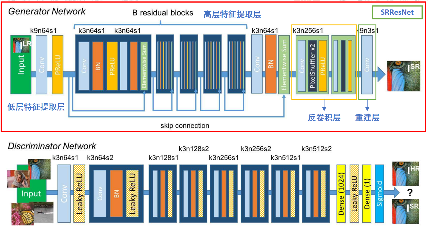 SRGAN是一种采用生成对抗网络来实现图像超分的网络结构,其主体由SRResNet构成的生成网络以及一个简单分类网络构成的判别网络,SRGAN网络其重要贡献在于其对训练网络的损失函数的改进,就以往的经验来看,psnr值得增高不一定能够相比其它psnr值小的图像拥有更好的感知,所以SRGAN提出一种感知损失,感知损失一般由三部分构成:内容损失和对抗损失。内容损失主要有两种,一种是像素级别的MSE损失,另外一种是特征图级别的VGG损失,这儿的VGG损失是指将生成网络产生出来的输出输入到预训练了的VGG-19网络得到feature map和高清标签输入到VGG网络产生的feature map做loss,这种loss更能反应图片之间的感知相似度。另外的对抗损失便是判别器分类损失的负log值。