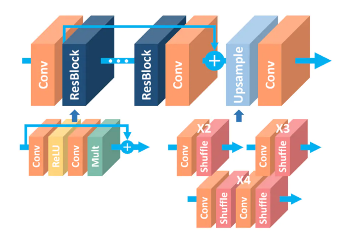 EDSR(Enhanced Deep Residual Networks)是一种借鉴了ResNet的残差机制在图像超分上面的一次尝试,其网络将之前的网络足够深,同时拥有比较多的残差模块,所以其在图像超分上面的表现超出了当时的所有模型。EDSR还有两个比较显著的改进就是在残差跳线上移除了BN层,减少了BN层的网络能够节省更多的计算开支并且对于图像超分这种low-level的应用,Batch正则化很有可能会移除掉网络中学习到的高频信息。为了使得更大的残差模型训练变得更加稳定,在残差处做了残差放缩,设置了0.1的放缩比,即只允许0.1的残差信息通过跳线流到下一层。