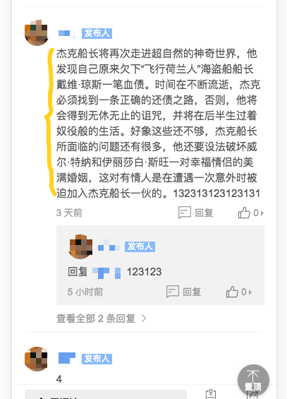 // 请求到评论数据之后getCommentsSuccess (data) {this.commentCount = data.metathis.currentPageComments = data.comments// 在点击“显示全文”的情况下,不重新渲染列表if (!this.clickDisplayAll) {this.currentPageComments.forEach((val, key) => {// 给评论列表中的每一项以及回复添加新属性this.$set(val, 'displayAll', true)if (val.limit_replies.length > 0) {this.$set(val.limit_replies[0], 'displayAll', true)}// 判定文字内容是否超过100,超过100的话,将“displayAll”属性置falseif (val.body.replace(/[\u0391-\uFFE5]/g, 'aa').length > 200) {val.displayAll = false}if (val.limit_replies.length > 0 && val.limit_replies[0].body.replace(/[\u0391-\uFFE5]/g, 'aa').length > 200) {val.limit_replies[0].displayAll = false}})// 此处"this.commentData"是用于页面上v-for的数组this.commentData = this.currentPageComments}this.clickDisplayAll = false}