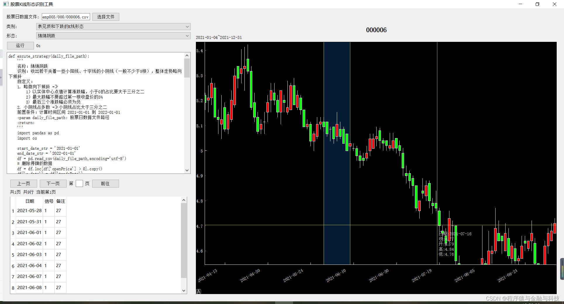 def excute_strategy(daily_file_path):'''名称:绵绵阴跌识别:收出若干夹着一些小阳线、十字线的小阴线(一般不少于8根),整体走势略向下倾斜自定义:1. 略微向下倾斜 =》1)以实体中心点值计算涨跌幅,小于0的占比要大于三分之二2)最大跌幅不要超过第一根收盘价的5%3) 最后三个涨跌幅必须为负2. 小阴线占多数 =》小阴线占比大于三分之二前置条件:计算时间区间 2021-01-01 到 2022-01-01:param daily_file_path: 股票日数据文件路径:return:'''import pandas as pdimport osstart_date_str = '2021-01-01'end_date_str = '2022-01-01'df = pd.read_csv(daily_file_path,encoding='utf-8')# 删除停牌的数据df = df.loc[df['openPrice'] > 0].copy()df['o_date'] = df['tradeDate']df['o_date'] = pd.to_datetime(df['o_date'])df = df.loc[(df['o_date'] >= start_date_str) & (df['o_date']<=end_date_str)].copy()# 保存未复权收盘价数据df['close'] = df['closePrice']# 计算前复权数据df['openPrice'] = df['openPrice'] * df['accumAdjFactor']df['closePrice'] = df['closePrice'] * df['accumAdjFactor']df['highestPrice'] = df['highestPrice'] * df['accumAdjFactor']df['lowestPrice'] = df['lowestPrice'] * df['accumAdjFactor']# 开始计算df['type'] = 0df.loc[df['closePrice'] >= df['openPrice'], 'type'] = 1df.loc[df['closePrice'] < df['openPrice'], 'type'] = -1df['body_length'] = abs(df['closePrice'] - df['openPrice'])df['target_yeah'] = 0df.loc[df['body_length']/df['closePrice'].shift(1)<0.015,'target_yeah'] = 1# df['center_val'] = (df['closePrice']+df['openPrice'])/2df['center_val'] = df['closePrice']df['center_chg'] = df['center_val'] - df['center_val'].shift(1)df.reset_index(inplace=True)df['i_row'] = [i for i in range(len(df))]df['ext_0'] = df['target_yeah'] - df['target_yeah'].shift(1)df['ext_1'] = df['target_yeah'] - df['target_yeah'].shift(-1)df_s = df.loc[df['ext_0']==1].copy()df_e = df.loc[df['ext_1']==1].copy()s_row_list = df_s['i_row'].values.tolist()e_row_list = df_e['i_row'].values.tolist()two_row_list = s_row_list + e_row_listtwo_row_list.sort()s_list = []e_list = []start_yeah = Falsefor item in two_row_list:if start_yeah:if item in s_row_list:s_list.append(item)if item in e_row_list:e_list.append(item)else:if item in s_row_list:s_list.append(item)start_yeah = Truepassdf['signal'] = 0df['signal_name'] = ''# 只标记出区间中起始开始有效的8根K线for s,e in zip(s_list,e_list):if e-s < 8:continuetemp_s = Nonetemp_e = Nonefor i in range(s,e-8):chg_num = 0n_num = 0max_chg = Nonechg_list = []for j in range(8):if max_chg is None or df.iloc[i+j]['center_chg'] < max_chg:max_chg = df.iloc[i+j]['center_chg']if df.iloc[i+j]['center_chg']<0:chg_list.append(-1)chg_num += 1else:chg_list.append(1)if df.iloc[i+j]['type']==-1:n_num += 1passif chg_num/8>0.66 and n_num/8>0.66:if abs(max_chg)/df.iloc[i]['closePrice'] > 0.05:continueif chg_list[-1]==1 or chg_list[-2]==1 or chg_list[-3]==1:continuetemp_s = itemp_e = i + 8breakpassif temp_s:df.loc[(df['i_row']>=temp_s) & (df['i_row']<=temp_e),'signal'] = 1df.loc[(df['i_row']>=temp_s) & (df['i_row']<=temp_e),'signal_name'] = str(e-temp_s)passfile_name = os.path.basename(daily_file_path)title_str = file_name.split('.')[0]line_data = {'title_str':title_str,'whole_header':['日期','收','开','高','低'],'whole_df':df,'whole_pd_header':['tradeDate','closePrice','openPrice','highestPrice','lowestPrice'],'start_date_str':start_date_str,'end_date_str':end_date_str,'signal_type':'duration_detail','duration_len':[],'temp':len(df.loc[df['signal']==1])}return line_data