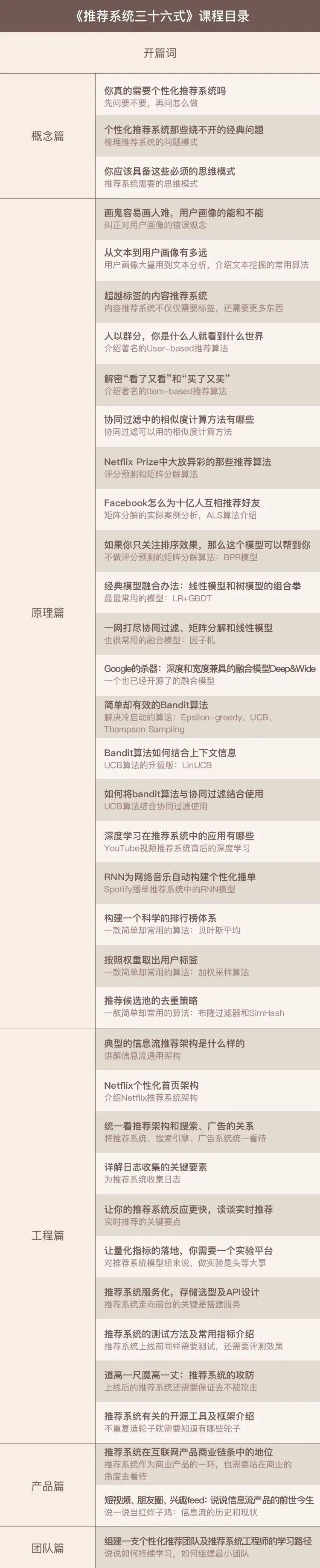在专栏中,他为学习者架构起整体的知识脉络,他还精讲了 20 个推荐系统算法,解析了 10 大算法落地事件案例,帮你彻底掌握推荐系统。。