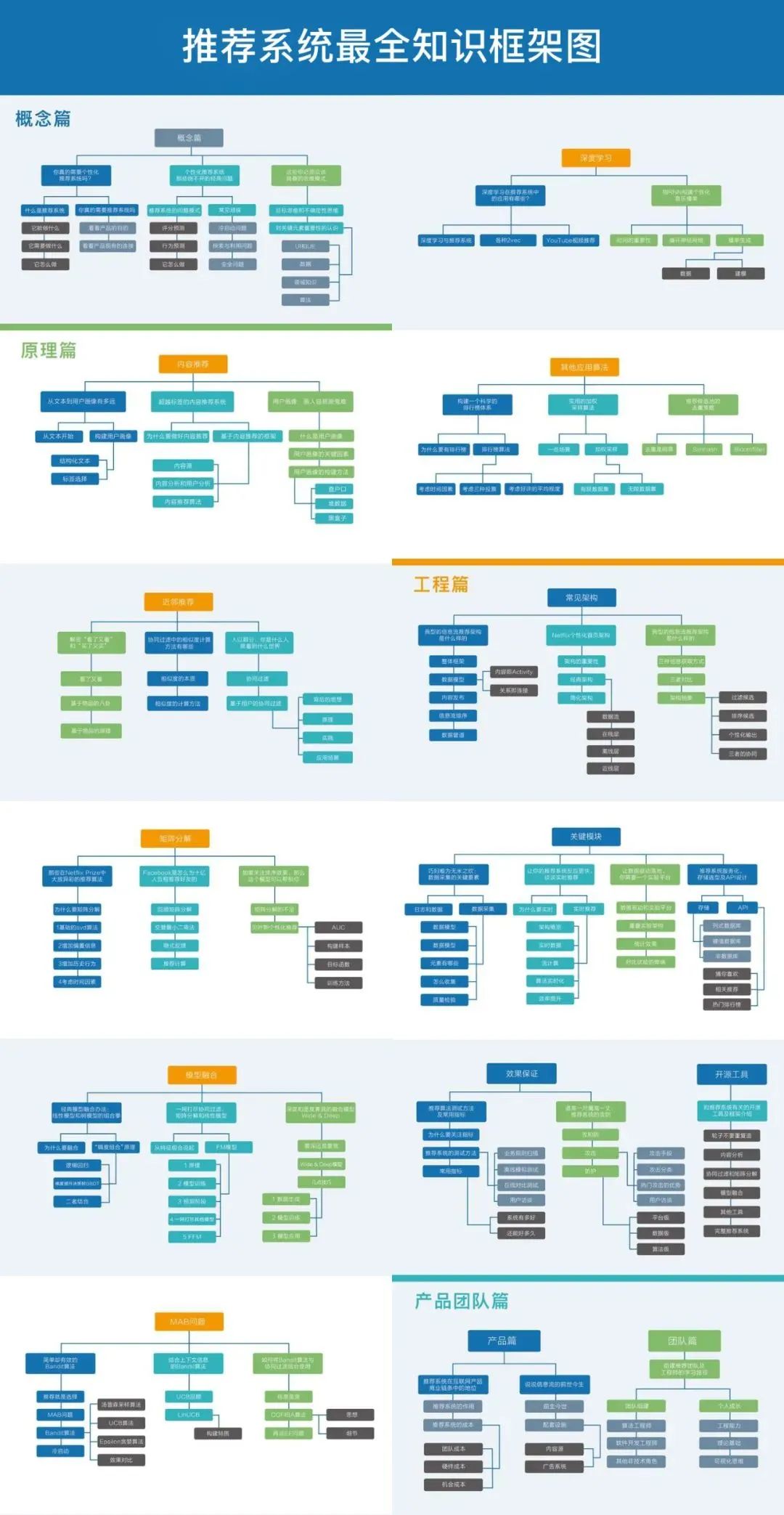 这里,分享给你一个「最全知识框架图」,几乎涵盖了推荐系统所有的核心知识点,帮你建立对推荐系统的全面认知,解决推荐系统起步的 80% 问题。