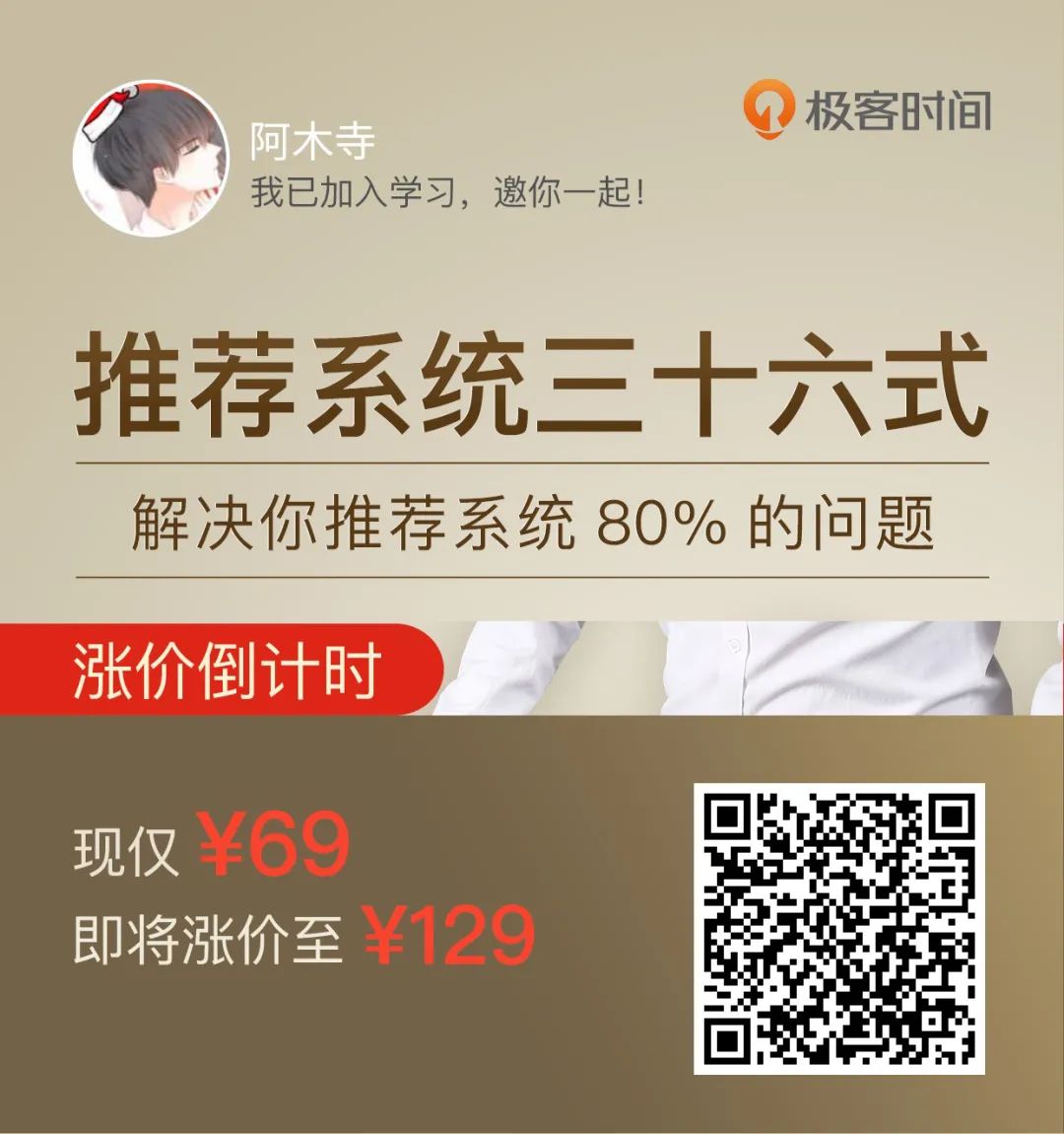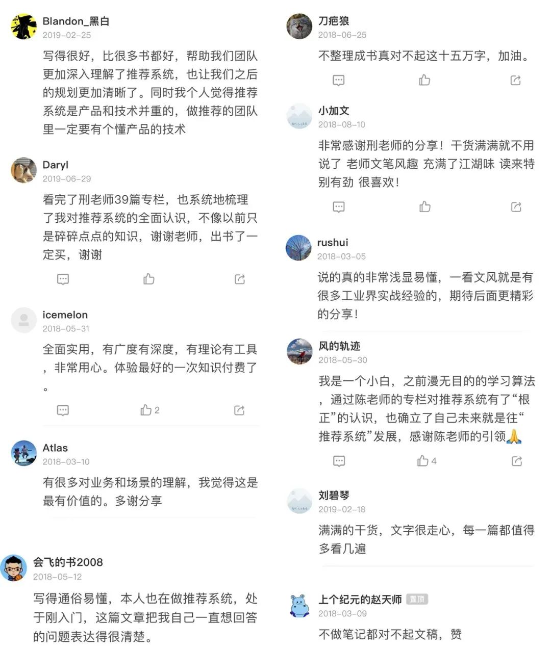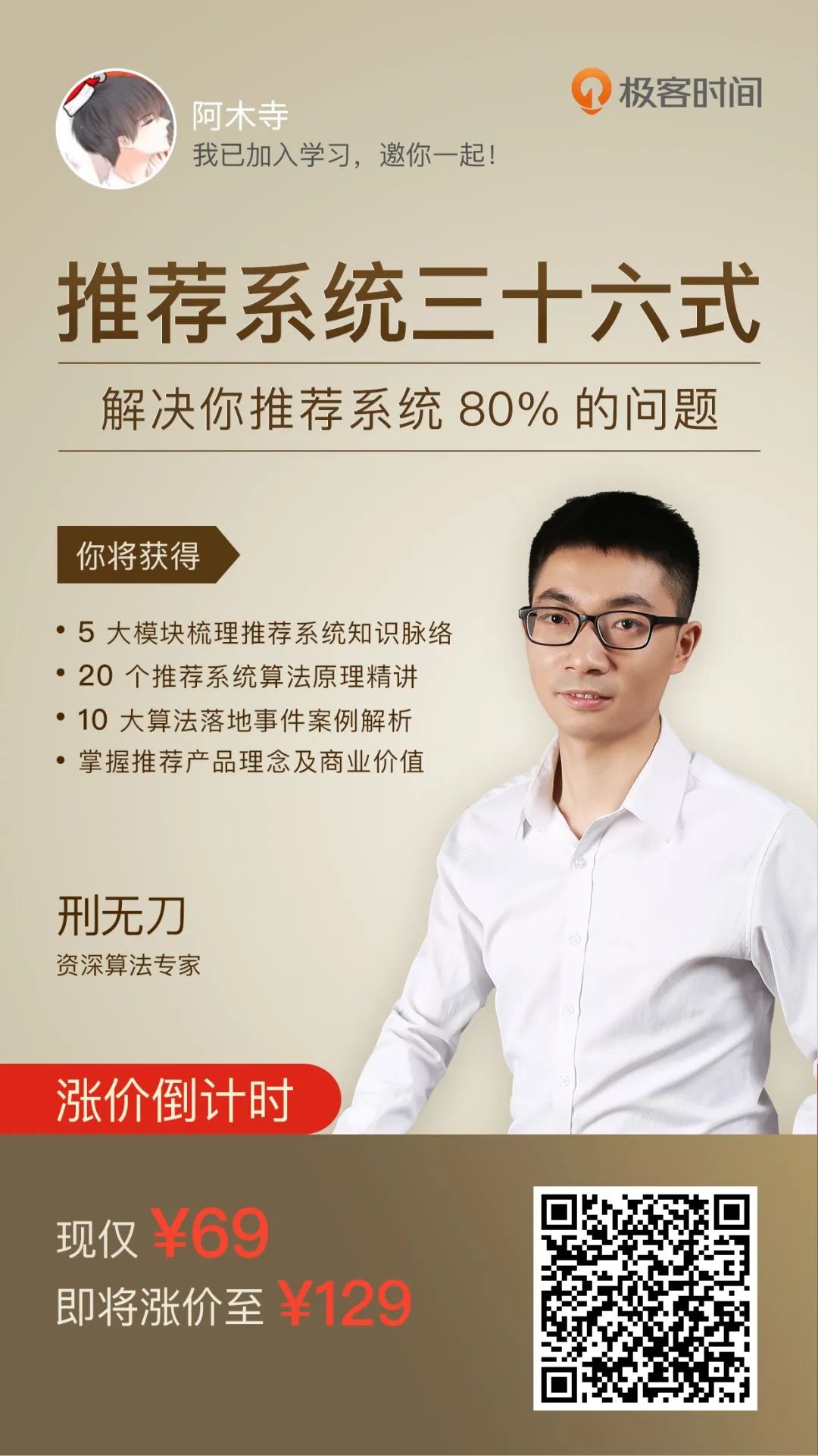 之前,订阅了他的专栏《推荐系统三十六式》,追着更新看了一遍,今年抽空又二刷了,既有广度又有深度,可以看出非常用心,不敢说学完就能 100% 掌握推荐系统,但绝对可以解决你工作里 80% 的问题。