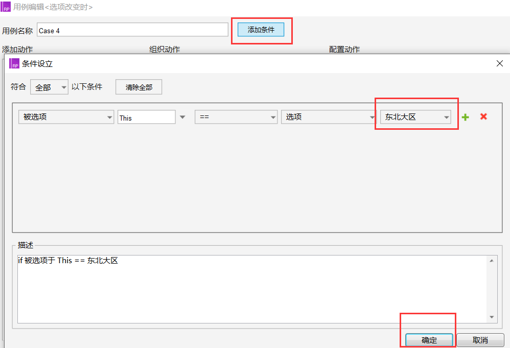 • 最重要的关联动作,给“区域名称”下拉框添加“选择改变时”用例,有多少个选择项,就需要添加多少个用例。
