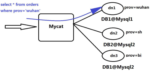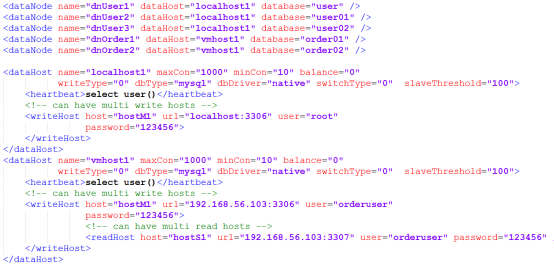 Orders 表被分为三个分片datanode(简称dn),这三个分片是分布在两台MySQL Server 上(DataHost),即datanode=database@datahost 方式,因此你可以用一台到N 台服务器来分片,分片规则为(sharding rule)典型的字符串枚举分片规则,一个规则的定义是分片字段(sharding column)+分片函数(rulefunction),这里的分片字段为prov 而分片函数为字符串枚举方式。