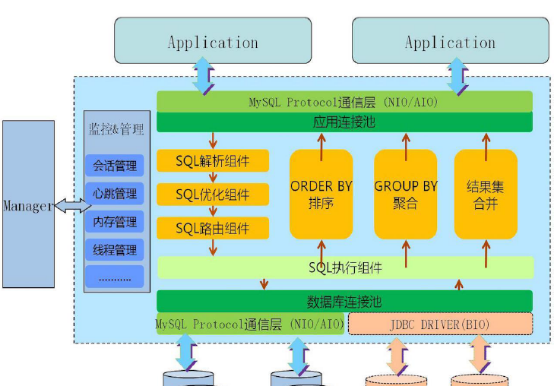 监控管理模块负责对 Mycat中的连接、内存等资源进行监控和管理。监控主要是通过管理命令实时地展现一些监控数据,例如连接数、缓存命中数等;管理则主要通过轮询事件来检测和释放不使用的资源。
