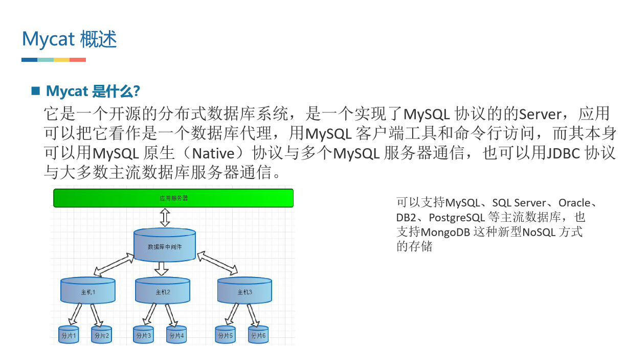 Mycat 是什么?从定义和分类来看,它是一个开源的分布式数据库系统,是一个实现了MySQL 协议的的Server,前端用户可以把它看作是一个数据库代理,用MySQL 客户端工具和命令行访问,而其后端可以用MySQL 原生(Native)协议与多个MySQL 服务器通信,也可以用JDBC 协议与大多数主流数据库服务器通信,其核心功能是分表分库,即将一个大表水平分割为N 个小表,存储在后端MySQL 服务器里或者其他数据库里。