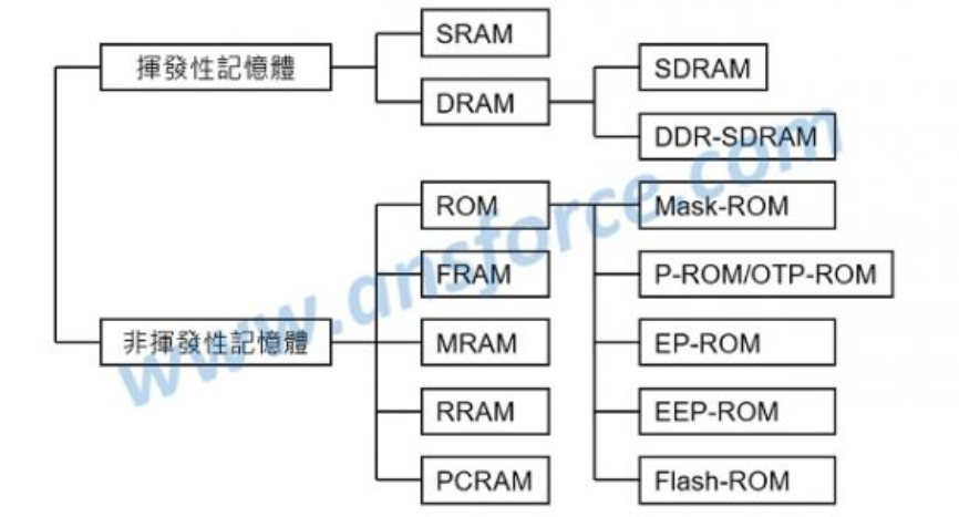 易失性存储器(Volatile Memory,VM):电源开启时资料存在,电源关闭则资料立刻流失(资料挥发掉),例如:SRAM、DRAM、SDRAM、DDR-SDRAM 等。