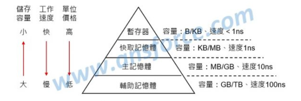 工作速度:辅助存储器(1ms)< 主存储器(10ns)< 快取存储器(1ns)< 暂存器(1ns)。