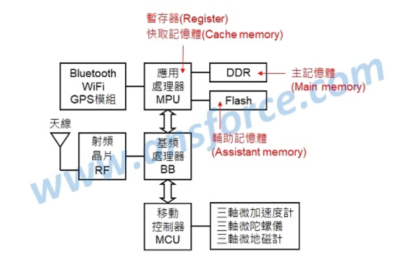 应用处理器主要是执行操作系统(Operating System,OS)与应用程序(Application program,App),暂存器与快取存储器目前都是内建在处理器内,其中暂存器用来设定处理器的功能,用来设定暂存器数值的程序,也就是用来趋动硬件的软件程序又称为“固件”(Firmware);快取存储器是在执行程序时用来“暂时储存”程序与资料的地方,由于在处理器内离运算单元比较近,可以缩短程序与资料来回的时间,加快程序的执行速度因此称为“Cache”。