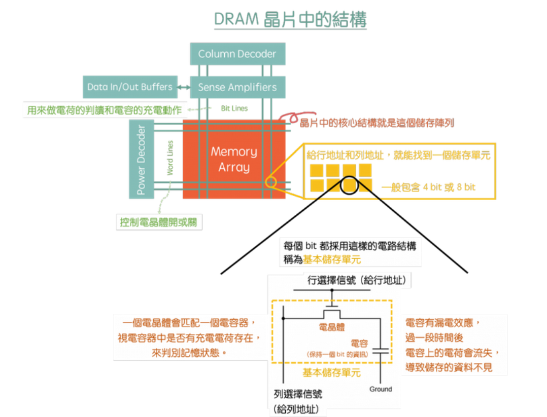 这个基本储存单元中包含了一个晶体管匹配一个电容。然后就可以视电容器是否有充电电荷存在、来判别目前的记忆状态。