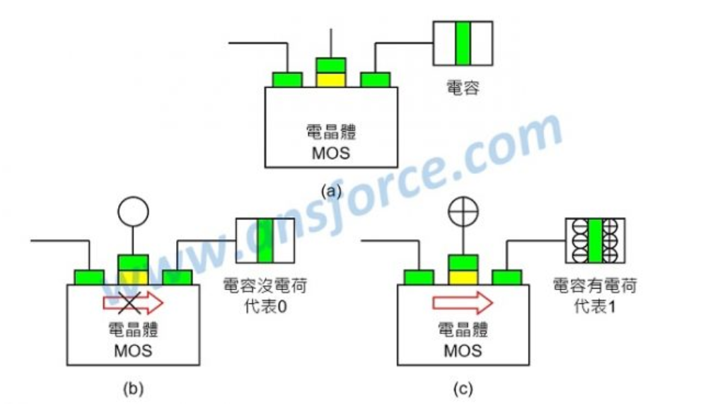 DRAM 使用一个晶体管(MOS)与一个电容来储存一个位的资料(一个 0 或一个 1),如图四(a)所示,当晶体管(MOS)不导通时没有电子流过,电容没有电荷,代表这一个位的资料是 0,如图四(b)所示;当晶体管(MOS)导通时(在闸极施加正电压),电子会由源极流向汲极,电容有电荷,代表这一个位的资料是 1,为了要将这些流过来的电荷“储存起来”,因此必须使用一个微小的电容,如图四(c)所示,DRAM 就是因为电容需要时间充电,所以速度比 SRAM 还慢。
