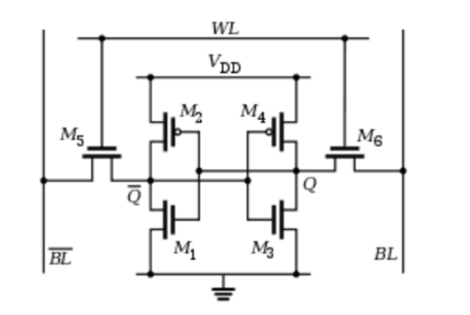 SRAM 的结构则较为复杂,一共有六个晶体管构成。我们能分别用 M1、M2、M3 到 M6 进行标记。这六个晶体管合起来才能保存一个 bit。
