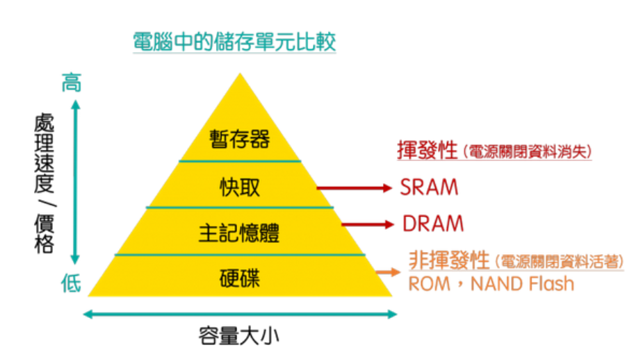 故目前”主存储器”还是使用 DRAM 技术,但小块用来拉速度的”快取”就是采用 SRAM。然而无论是 DRAM 还是 SRAM,一不供应电源就会丧失储存的数据,所以都叫做挥发性内存。