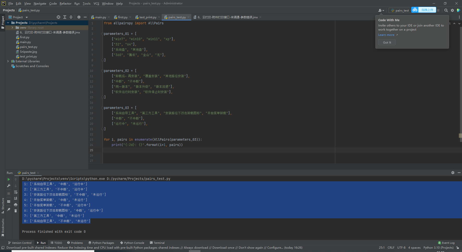 from allpairspy import AllPairsparameters_01 = [["win7", "win10", "win11", "xp"],["32", "64"],["系统盘", "其他盘"],["360", "腾讯", "金山", "无"],