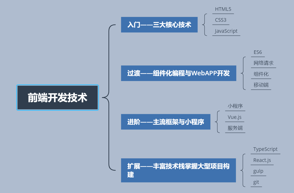 下图简单介绍了一下前端开发需要学习的内容,接下来会由上而下,自浅入深的学习相关知识。