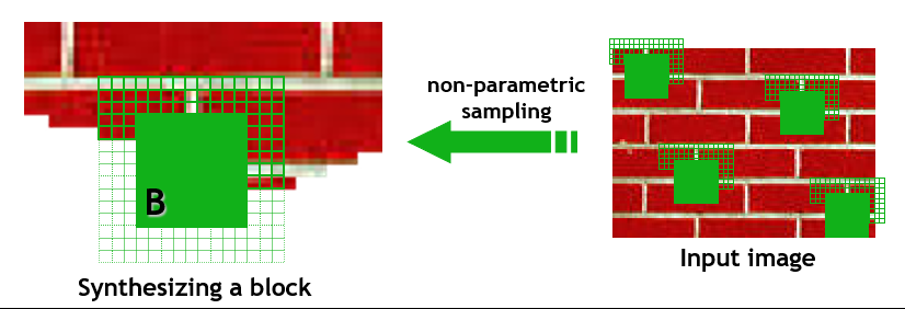 - Main idea:synthesize new texture by taking patches of existing texture and stitching them together in a consistent way.(把现有的纹理以一致的方式拼接在一起生成新的纹理)