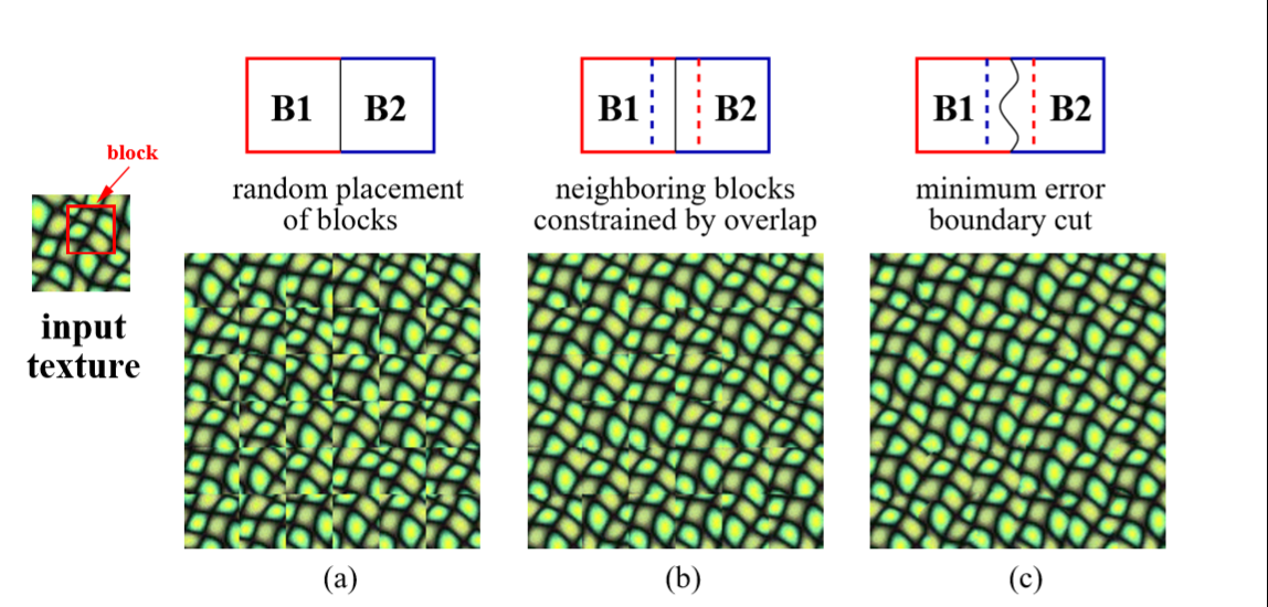 a new image is synthesized by stitching together small patches of existing images.(将已有图像的小块拼接在一起,合成出新的图像)