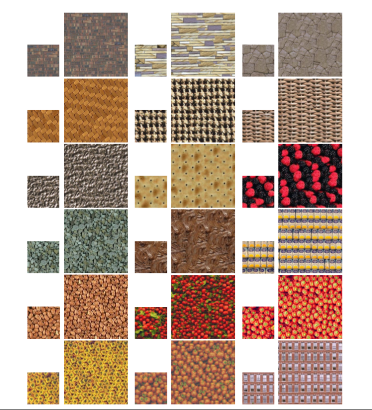 - Such an algorithm should be able to take a sample of texture and generate an unlimited amount of image data which, while not exactly like the original, will be perceived by humans to be the same texture.(提取纹理样本-->生成无限数量的图像数据-->与原图像不同但会被感知为相同的纹理)