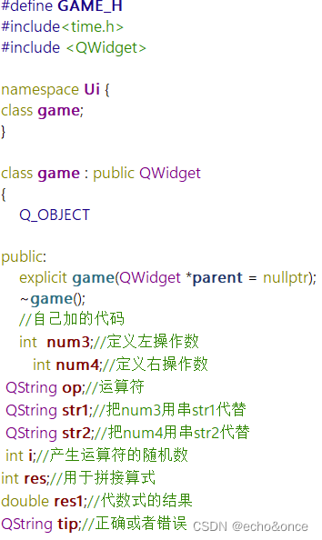 int num3;//定义左操作数int num4;//定义右操作数QString op;//运算符QString str1;//把num3用串str1代替QString str2;//把num4用串str2代替int i;//产生运算符的随机数