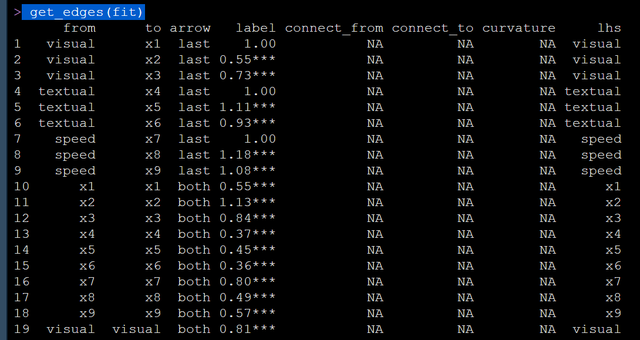 因为图中的边还是比较多的边所以运行get_edges(fit)的结果非常长,我们可以看到输出中有边从哪儿开始from到哪儿去to,什么类型的箭头arrow,边的标签label等等。