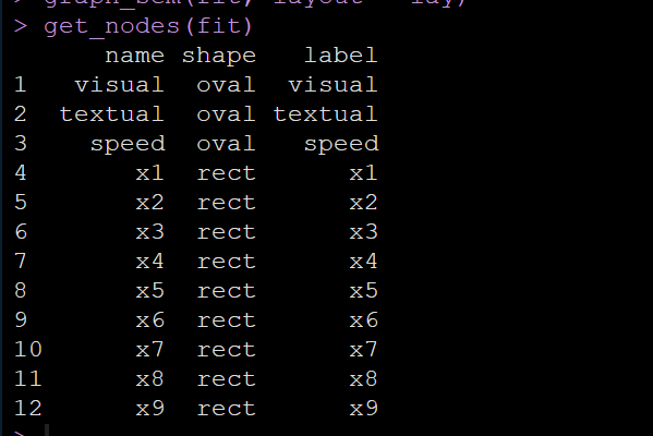 结果就显示我们是有3个椭圆的潜变量和9个方形的显变量,以及每个元素的标签。